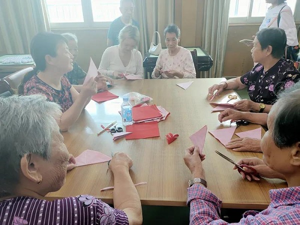 旁边的老师一边示范,一边耐心讲解每一个动作的要领,长者们互相学习,互相纠正,等待一张剪纸顺利做完,他们脸上纷纷绽起喜悦笑颜。