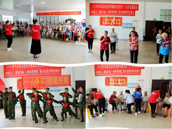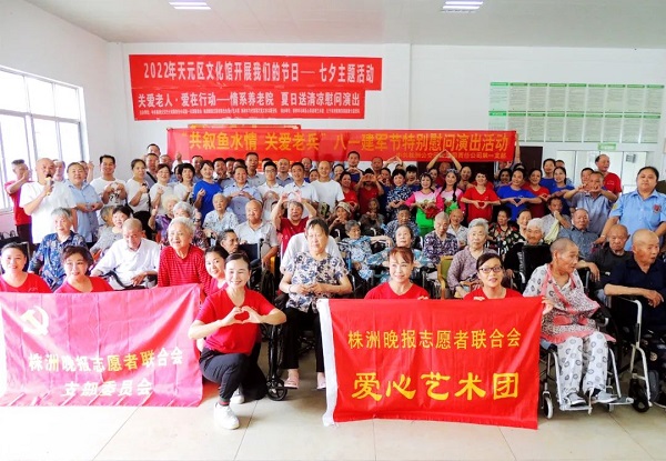 7月31日,株洲晚报志愿者联合会爱心艺术团、株洲市文化馆蓉之星文旅志愿分队及中共株洲公交巴士有限责任公司第一支部委员会的党员志愿者们走进株洲渌口区海福祥养老护理院,与院内的爷爷奶奶们一起庆祝八一建军节,让这些长辈们发展自己兴趣爱好的同时,共享幸福生活。